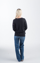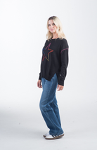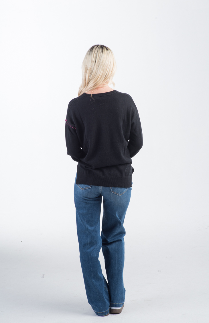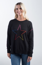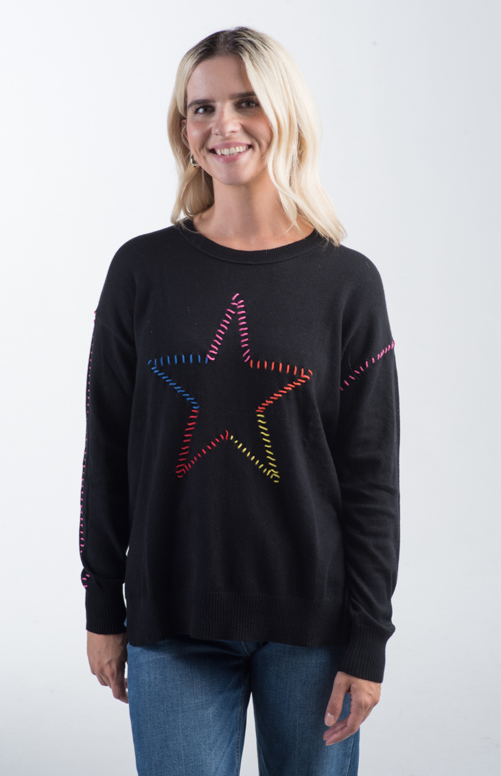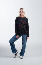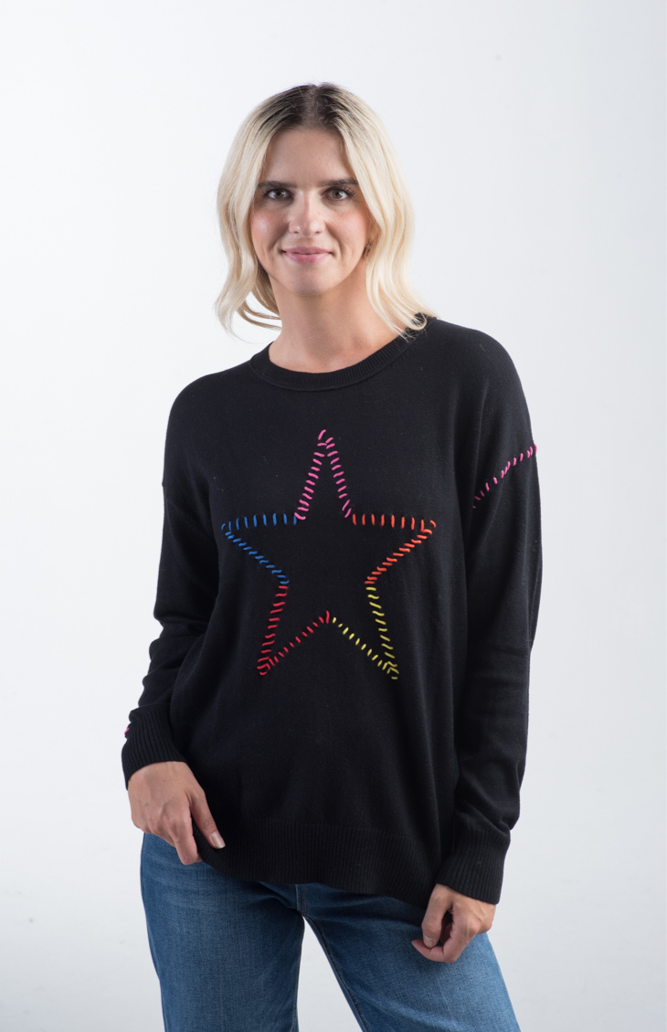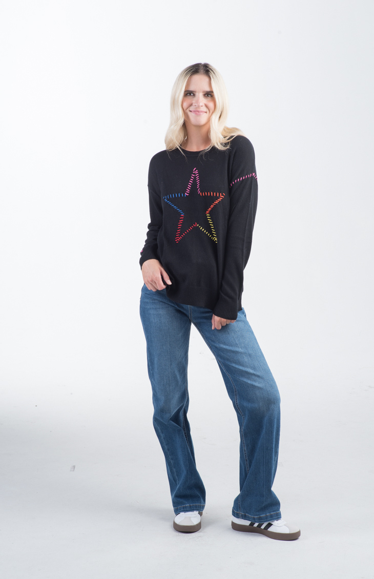 The Super Star Sweater in black features a bold, multicolored stitched star on the front with coordinating rainbow stitching along the arms. With a relaxed, slightly loose fit and classic crew neckline, this knit sweater adds a fun, casual vibe to your wardrobe. Ribbed cuffs and hem provide a comfortable, fitted finish, while the colorful accents pop against the black base for a playful look.