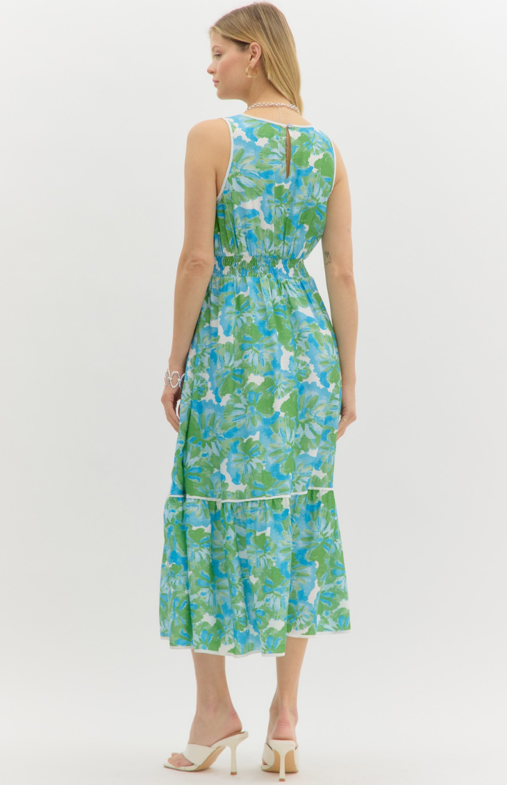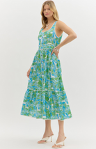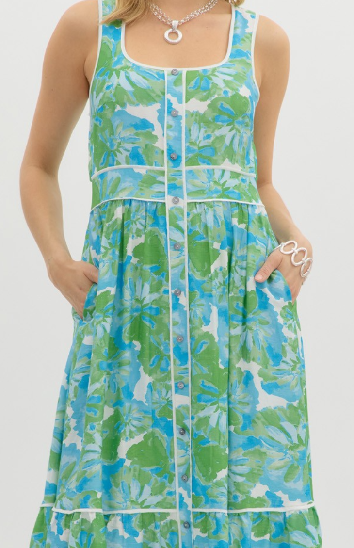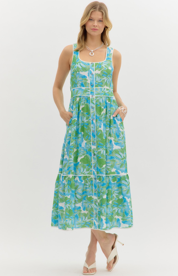 The Novi Maxi Dress is a breezy, floral must-have featuring a tiered silhouette, white piping details, front buttons, and flattering square neckline. With pockets and a vibrant blue-green print, it's your go-to for effortless baby shower, brunch, and office looks.