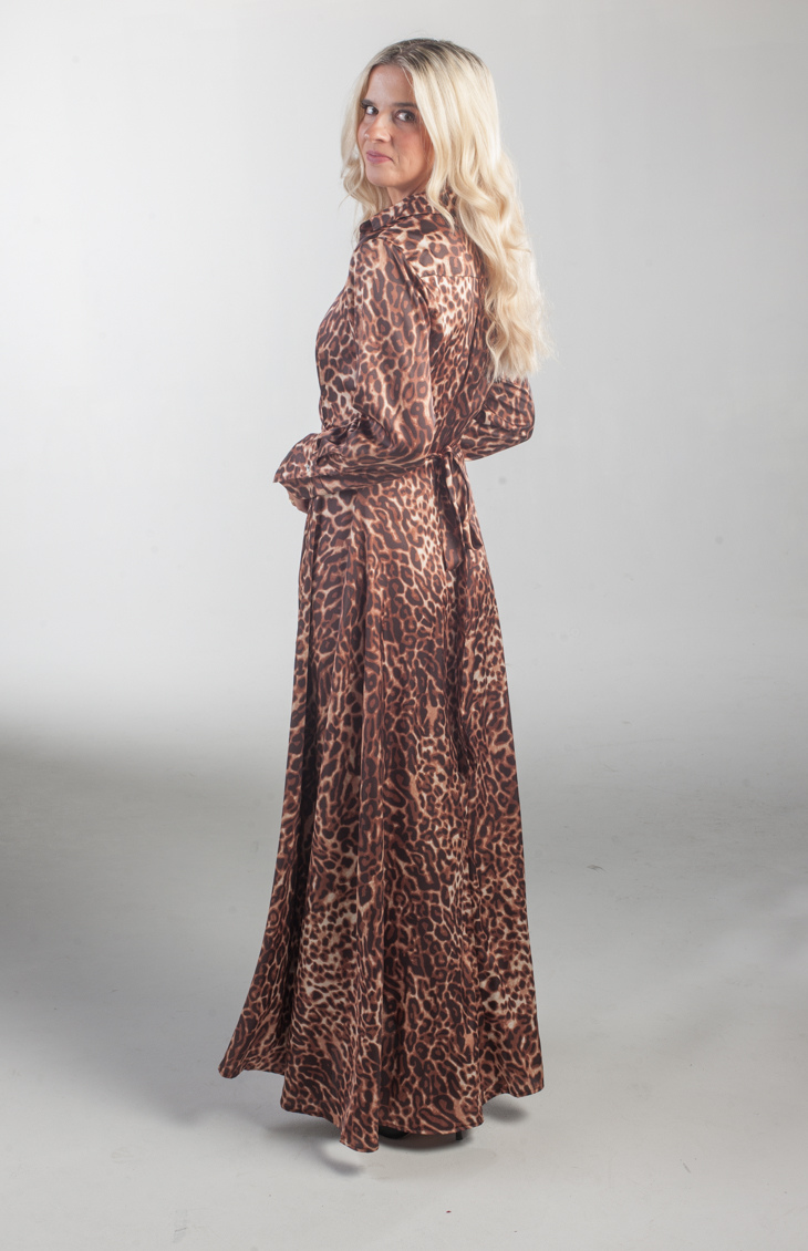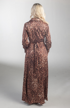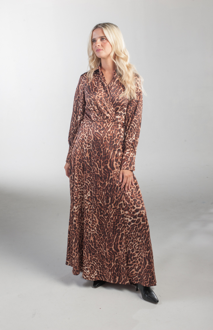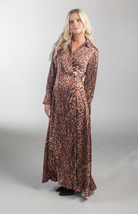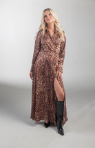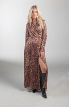 The There She Goes Maxi Dress is a long-sleeved wrap dress in bold leopard print. It features a flattering V-neckline, a cinched waist, and a flowy skirt with a subtle high slit for added drama. Made from silky, lightweight fabric, it drapes beautifully and is perfect for evening events or stylish daytime outings. Versatile enough to pair with boots, heels, or sandals.