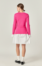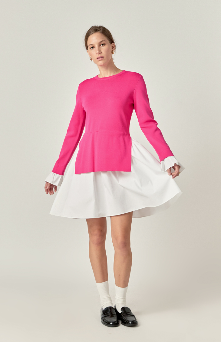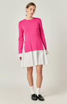 The sophisticated but fun Tulip Combo Dress blends chic knitwear with a structured flared skirt. The vibrant fuchsia top creates a bold yet sleek look. A striking contrast white flared skirt adds movement. This versatile dress is perfect for transitioning between seasons and can be styled effortlessly with loafers for a preppy look or heels for a chic evening ensemble.