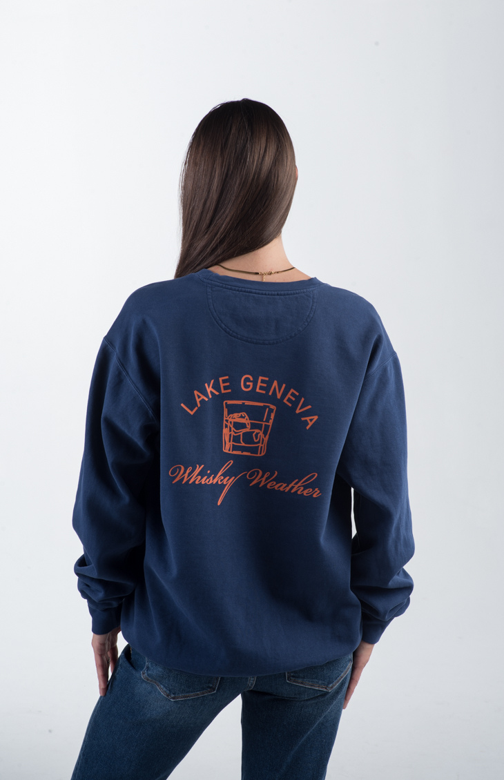 Stay cozy in the Whisky Weather Crewneck sweatshirt, featuring a whiskey glass graphic and the phrase "Lake Geneva Whisky Weather." This crewneck is perfect for chilly days and adds a fun touch to your wardrobe.
