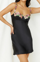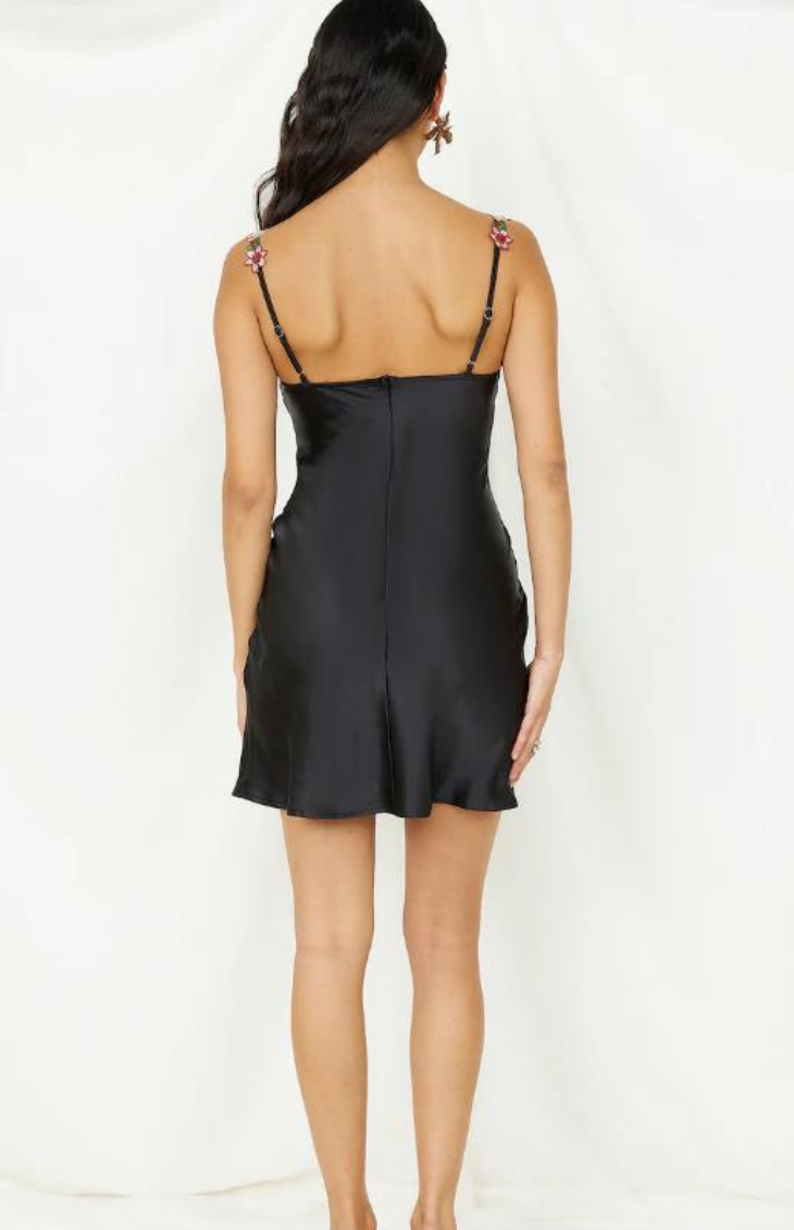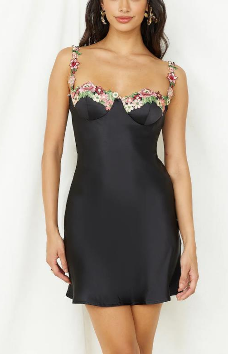 Delicate floral embroidery meets sleek satin in the Wildflower Fields Mini Dress. With dainty floral straps, a structured bust, and a silky finish, this dress is a stunning choice for a night out or special occasion.