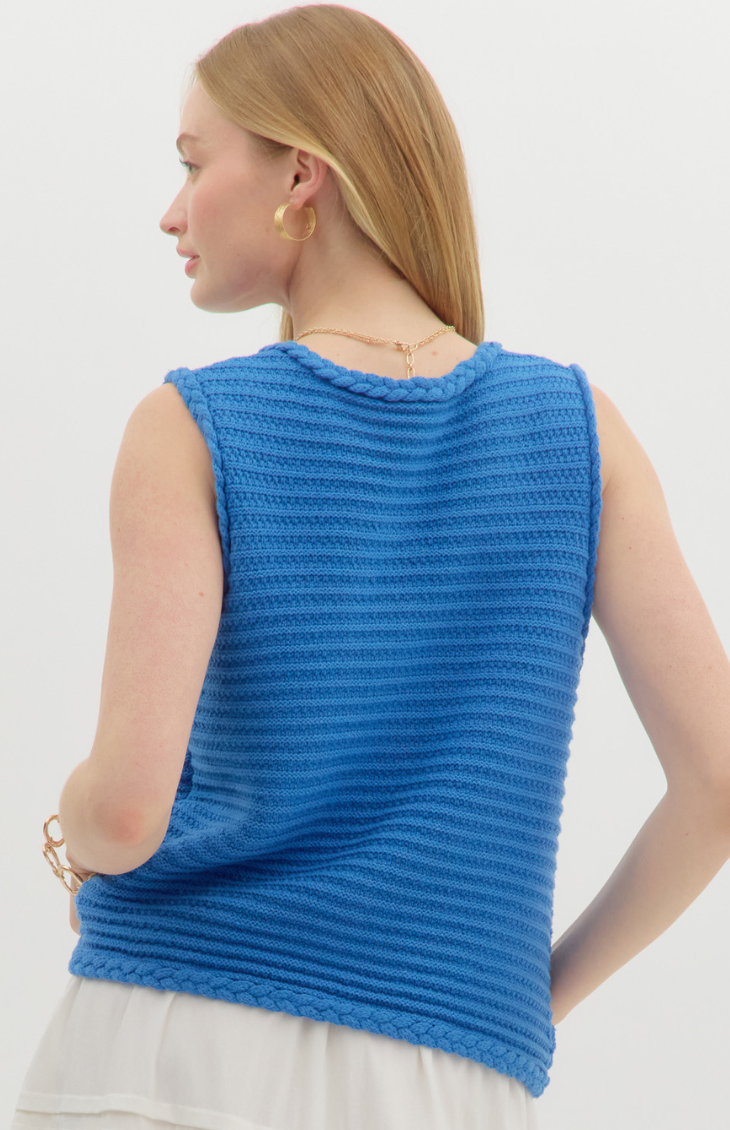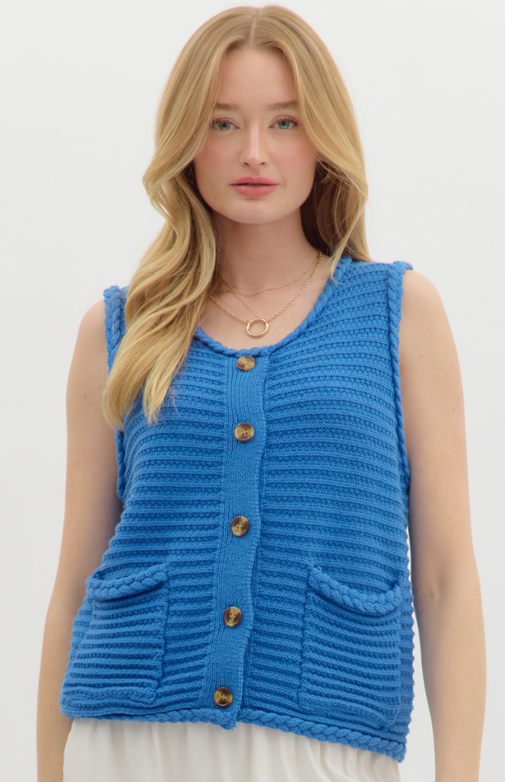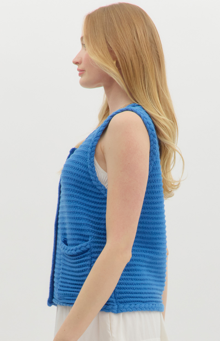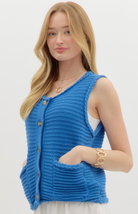Cozy meets cool in the Yelora Point Vest, crafted in a textured knit with chunky ribbed detailing. Featuring tortoise-style buttons and front patch pockets, this sleeveless layer adds a playful pop of cobalt blue to any look.