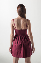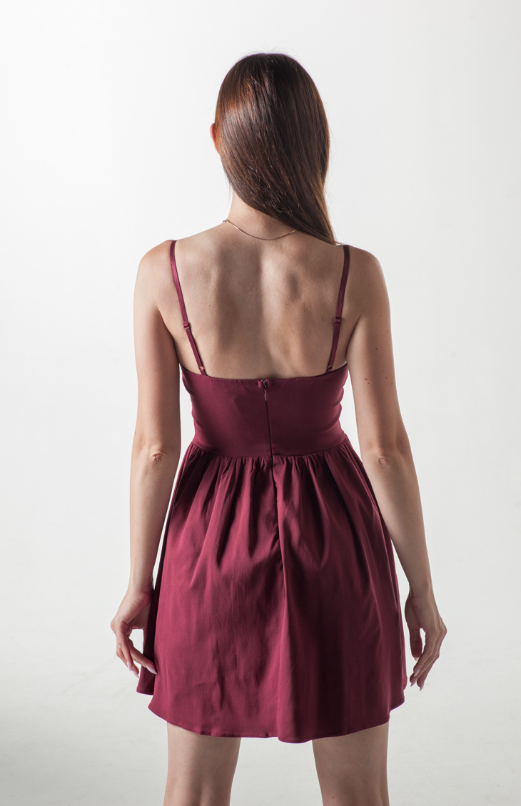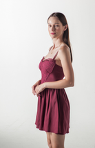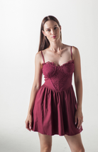 The Yeva Mini Dress in deep burgundy offers an elegant look with a soft, lightweight fabric and a lace overlay on the bustier-style bodice. It features structured cups, adjustable spaghetti straps, and a fitted waist that creates a defined silhouette. The flowy A-line skirt adds movement, while the sweetheart neckline with lace detailing enhances femininity. Ideal for date nights and special occasions.
