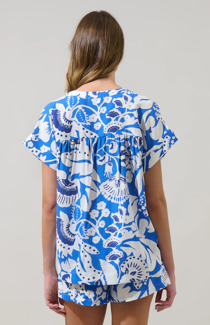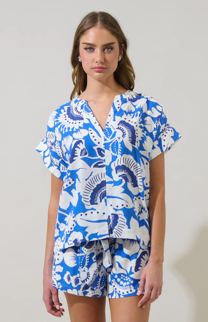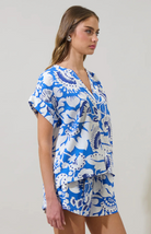 The Zaferia Floral Set is the perfect set for beach days with its bold blue and white floral print. The top features a split neckline and short sleeves. Tuck it into the matching mini shorts for a cinched, elevated look showing off the shorts' bow tie belt. Leave untucked for a relaxed and casual look.