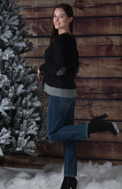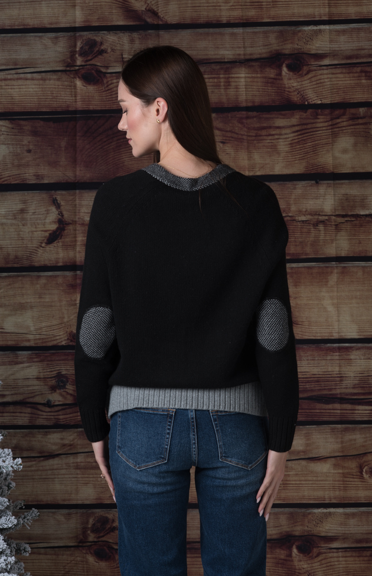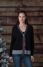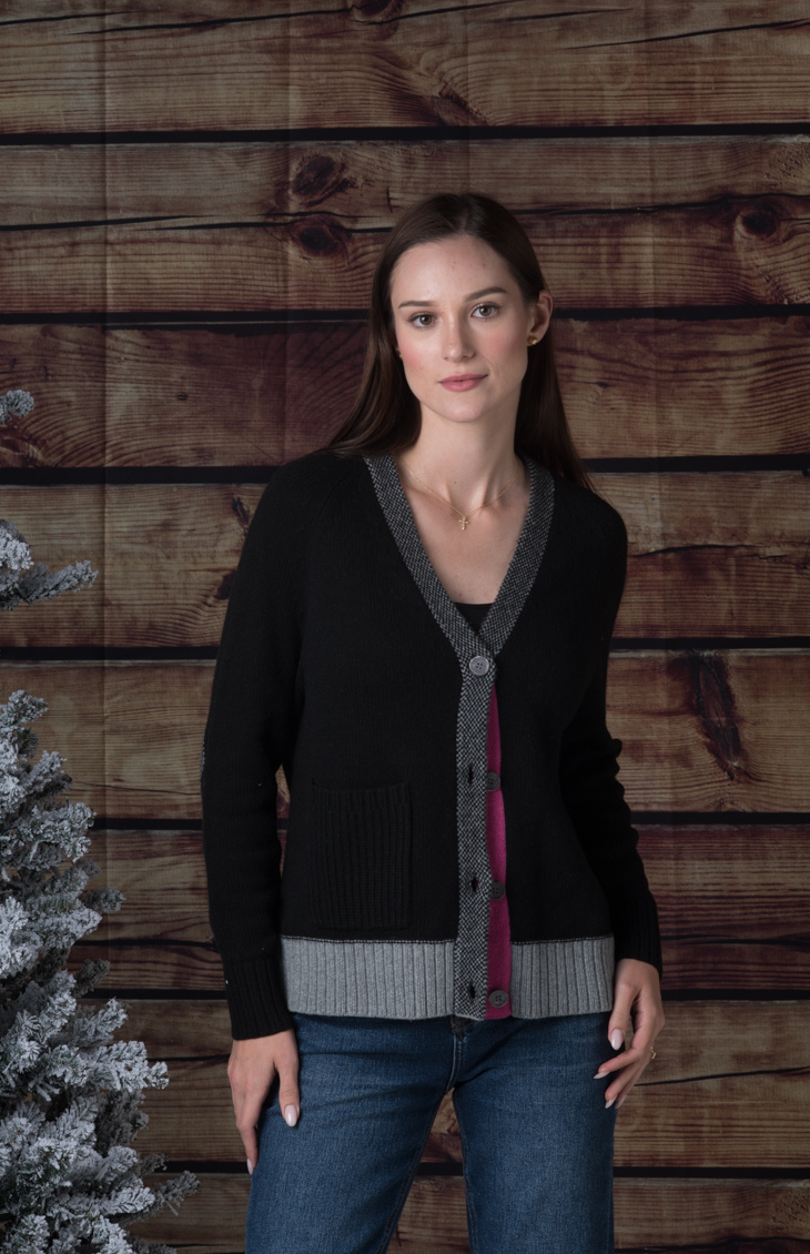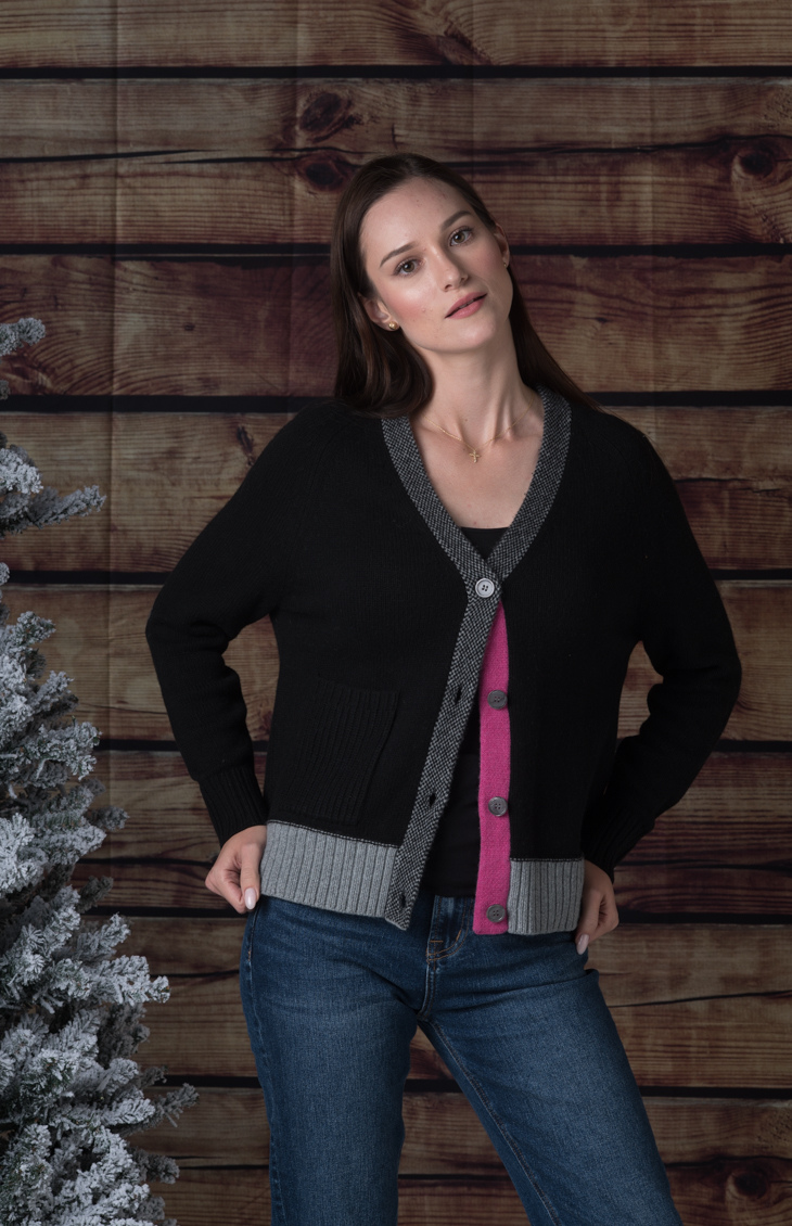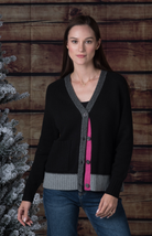 The Zaket & Plover Elbow Patch Cardigan is a chic black cardigan featuring stylish black and white lining with a pop of pink on the inside. Designed for comfort, this cozy cardigan has a button-down closure and elbow patches for added sophistication. Perfect for layering over your favorite tops, it’s ideal for casual outings and cozy evenings.