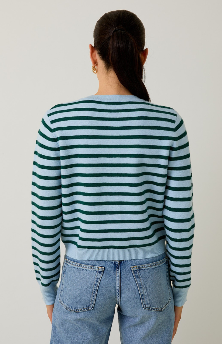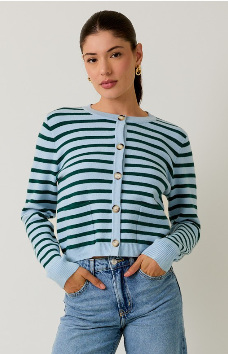 Brighten up your wardrobe with the Hearthlight Cardigan. Featuring bold green and light blue stripes, this button-up cardigan brings a playful twist to a classic silhouette. Designed with front pockets and a polished crew neckline, it’s perfect for layering over your favorite tops or pairing with denim for an effortlessly chic look.