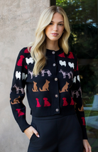 Show off your playful side with the Puppy Love Cardigan. Featuring an allover dog silhouette pattern in bold, contrasting colors, this button-up cardigan brings a fun and cozy charm to your everyday look. Its classic crew neckline and relaxed fit make it an easy layering piece for both casual outings and laid-back weekends.