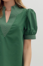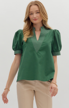 The Everglades Top is a modern classic with bold charm. Designed with short puff sleeves and a structured V-neckline, this top stands out with its intricate contrast stitch detailing that adds depth and style. Crafted from lightweight woven fabric, it offers a polished yet comfortable fit perfect for workdays or evenings out.