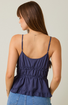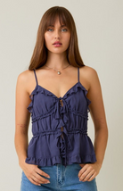 The Quinny Top is a feminine and flirty piece featuring delicate spaghetti straps, ruffled detailing, and adjustable front tie closures for a customizable fit. This lightweight navy cami pairs perfectly with denim for an effortless daytime look or can be dressed up for an evening out with a black mini skirt and boots. Its flattering peplum-style silhouette and playful layered accents make it a versatile must-have for any wardrobe.