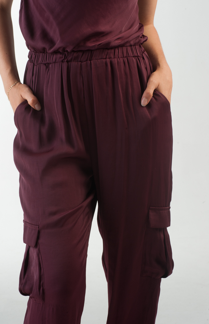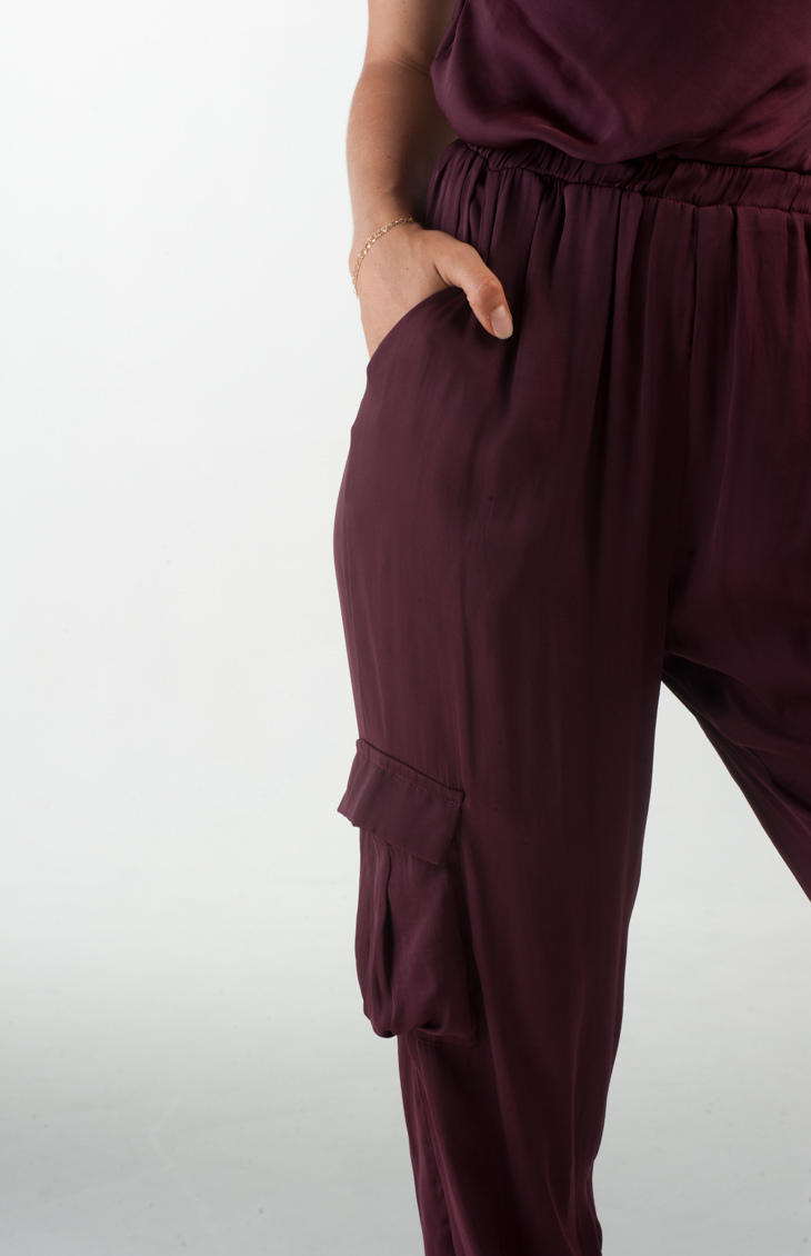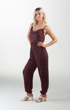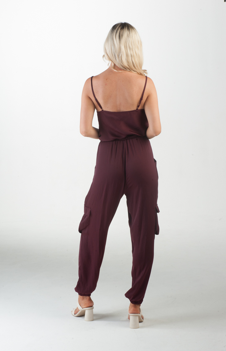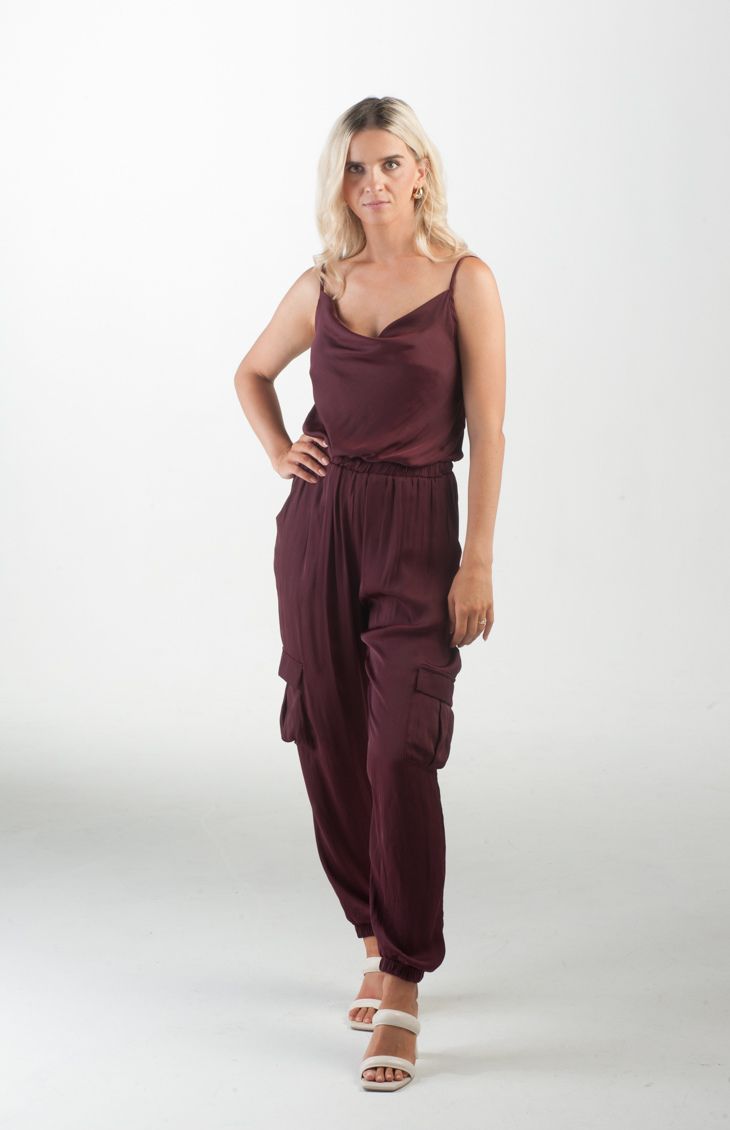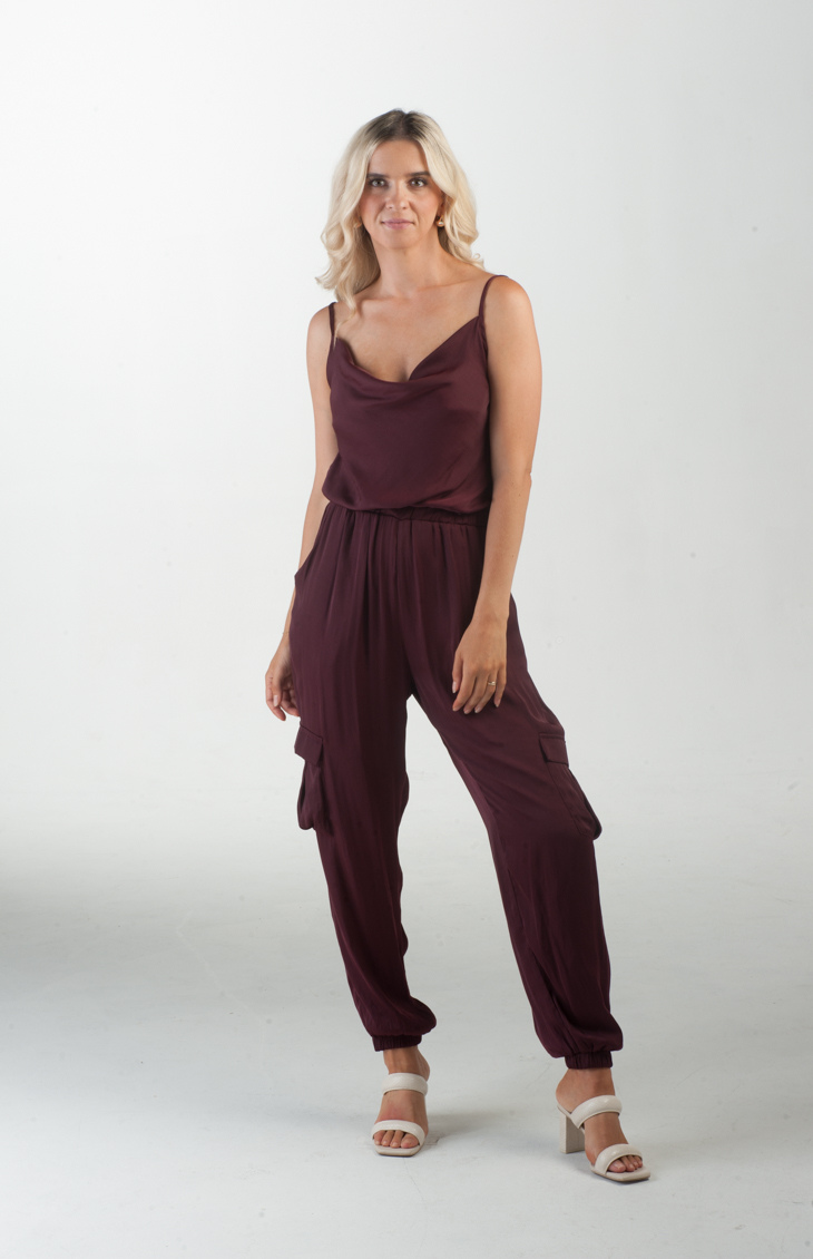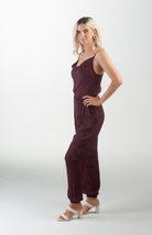 Introducing the Asha Jumpsuit in a rich burgundy hue, featuring a soft cowl neckline and thin adjustable straps for a comfortable, elegant fit. The elastic waistband creates a flattering silhouette, while side cargo pockets add a functional, casual touch. With tapered legs and elastic cuffs, this jumpsuit offers a relaxed yet stylish look, perfect for both casual and dressy occasions.