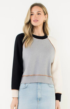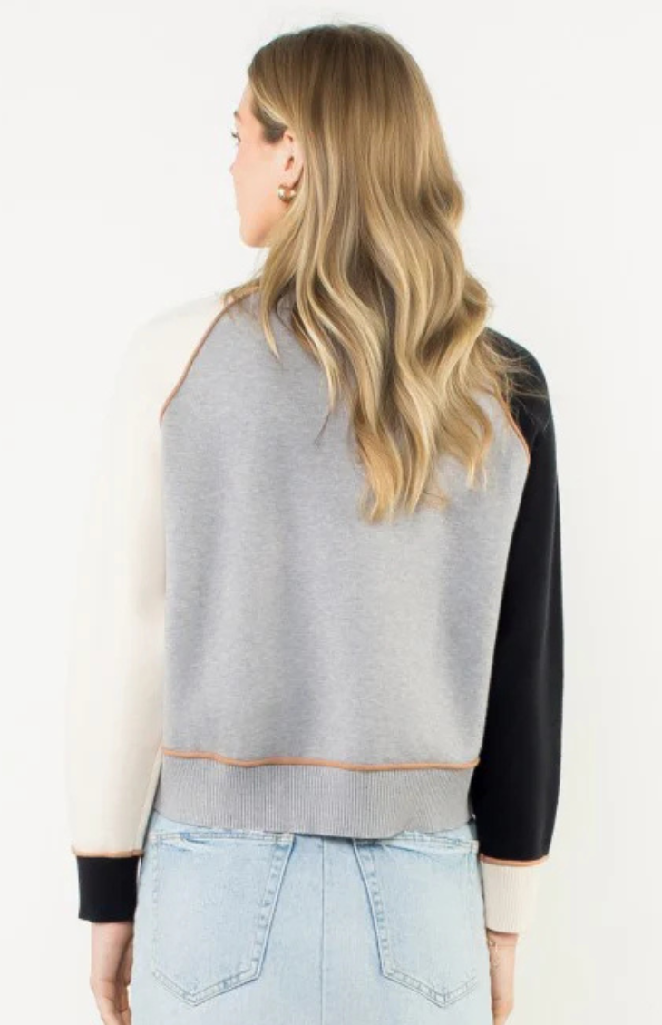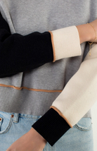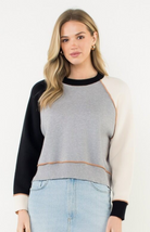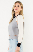 The Breezy Dusk Sweater is a laid-back essential with a cool, colorblock twist. Featuring a grey bodice with a relaxed fit, and soft contrast sleeves in cream and black, this lightweight pullover is elevated by its subtle camel piping throughout. The grey body pairs effortlessly with denim or joggers for casual days this fall. It’s your ideal go-to for that in-between weather when you want to be stylish without sacrificing comfort.