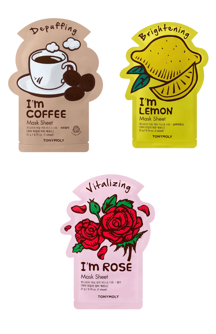 Set Includes: I’m Rose Sheet Mask, I’m Lemon Sheet Mask, I’m Coffee Sheet Mask, I’m Cherry Blossom Sheet Mask, ’m Pearl Sheet Mask