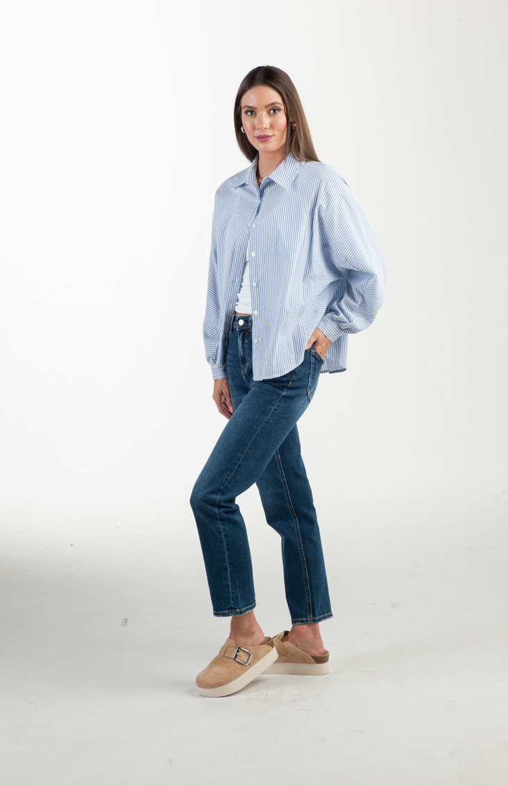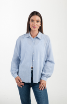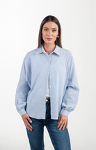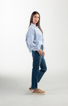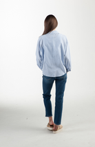 The Bristol Button Up in navy stripe features light blue and white vertical stripes with a classic collared neckline and button-up front. Its relaxed fit and slightly ballooned sleeves with buttoned cuffs add a stylish touch, while the lightweight, breathable fabric makes it perfect for layering over a tank or tee. Ideal for pairing with jeans or shorts for a laid-back, casual look.