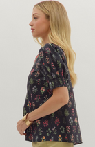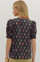 The Burlington Top is a charming blouse with a mix of vintage-inspired florals and modern detailing. Designed in a lightweight cotton with a black base, it features a colorful botanical print, puff sleeves with smocked cuffs, and a flattering split neckline trimmed with bold green and red accents. Effortlessly versatile, it pairs beautifully with trousers, skirts, or denim for a playful yet sophisticated look.
