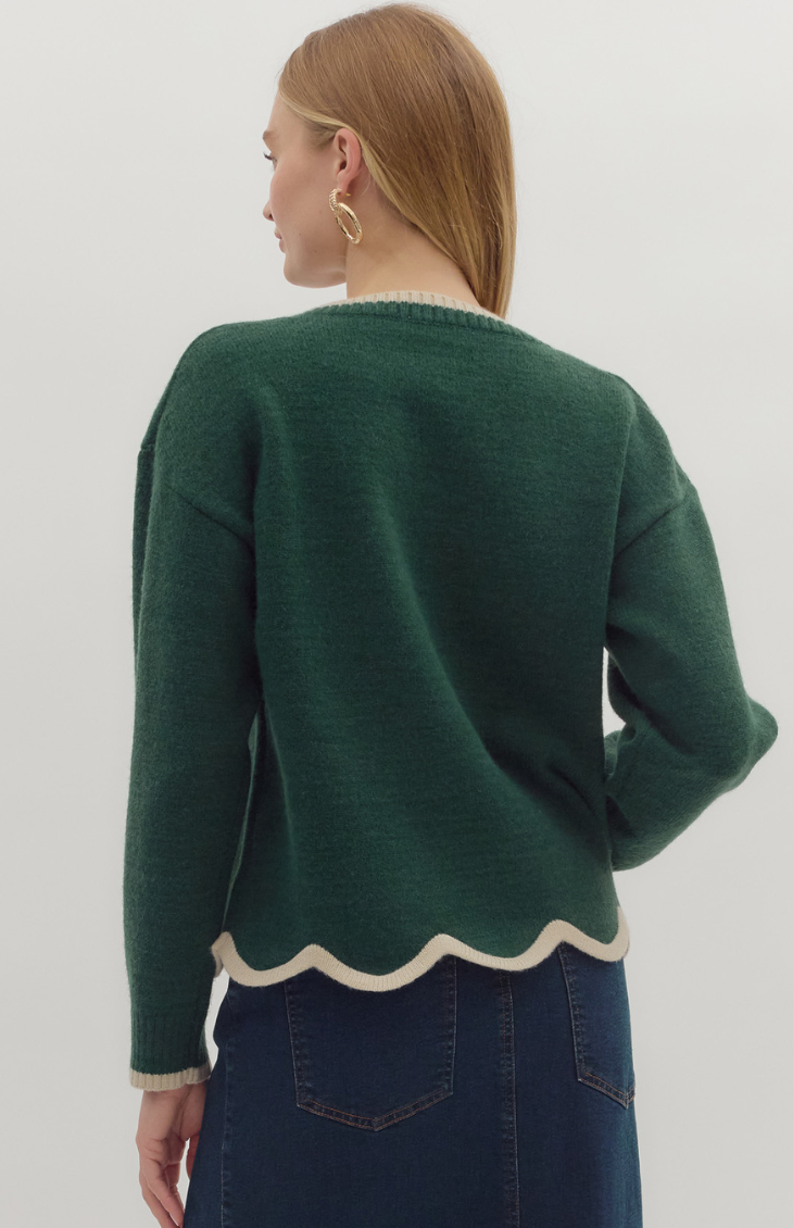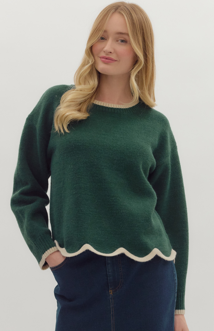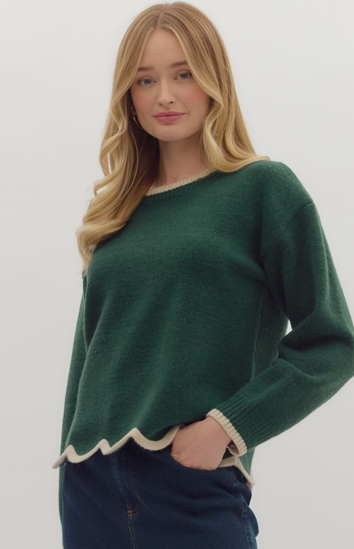 The Daye Sweater is a playful and modern knit pullover with its large-scale scalloped hem. The contrast off-white accents on the hemline, arm cuffs, and crewneck. Pair with denim and brown accessories for a festive fall look.
