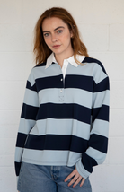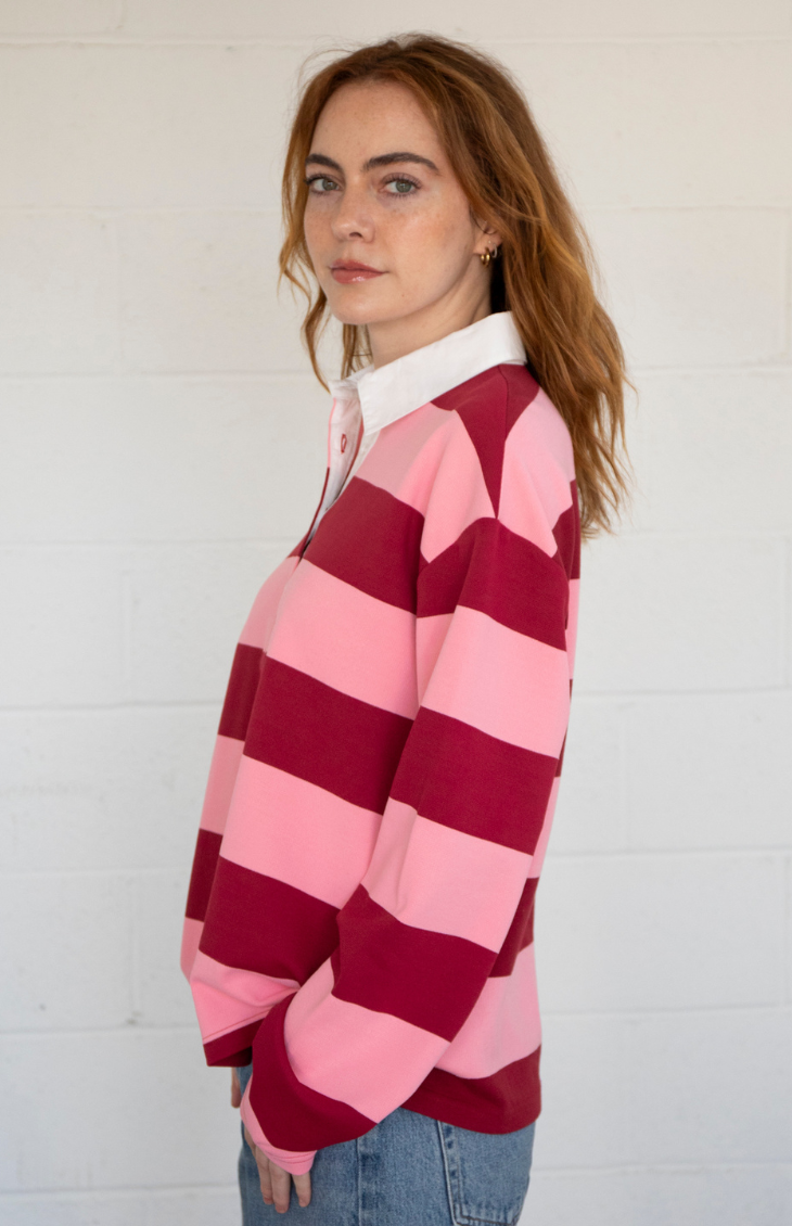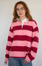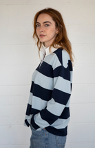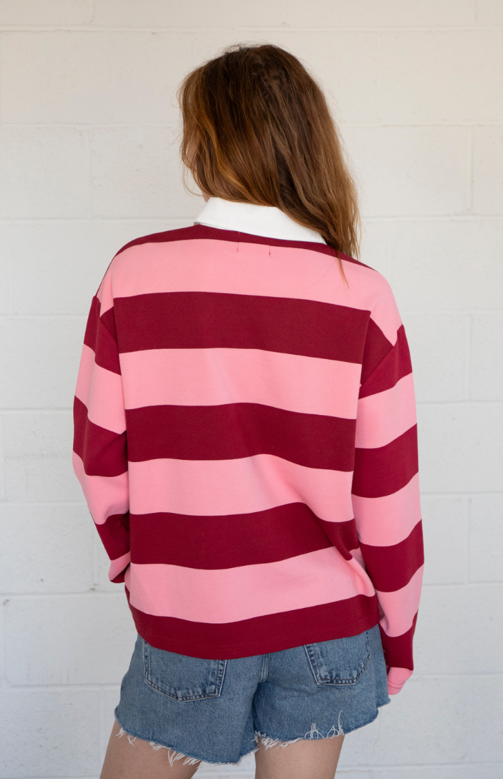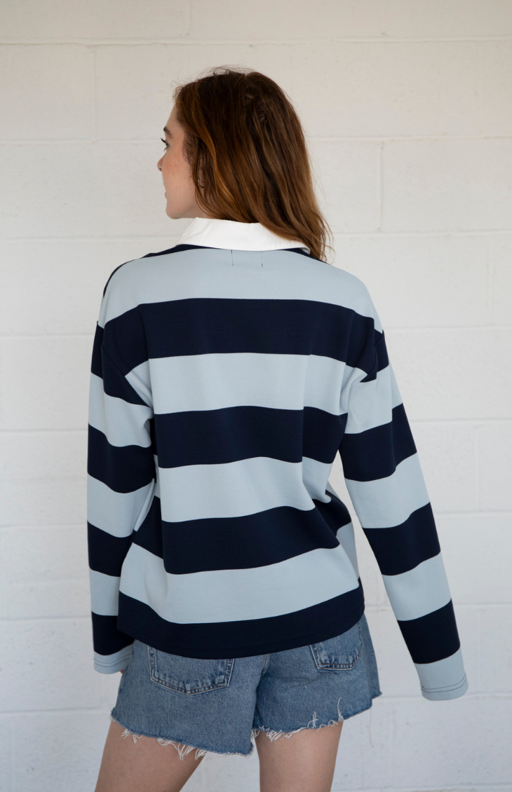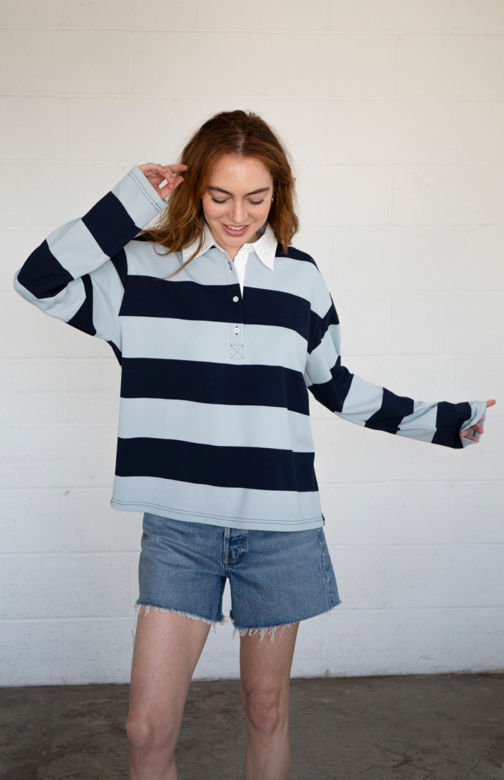 The Early Leaves Top brings a sporty yet polished vibe with its bold stripes and crisp collar. Featuring a relaxed fit and button-up neckline, this top is perfect for casual days or layering with your favorite outerwear. Available in dusty blue or pink for a versatile pop of color.