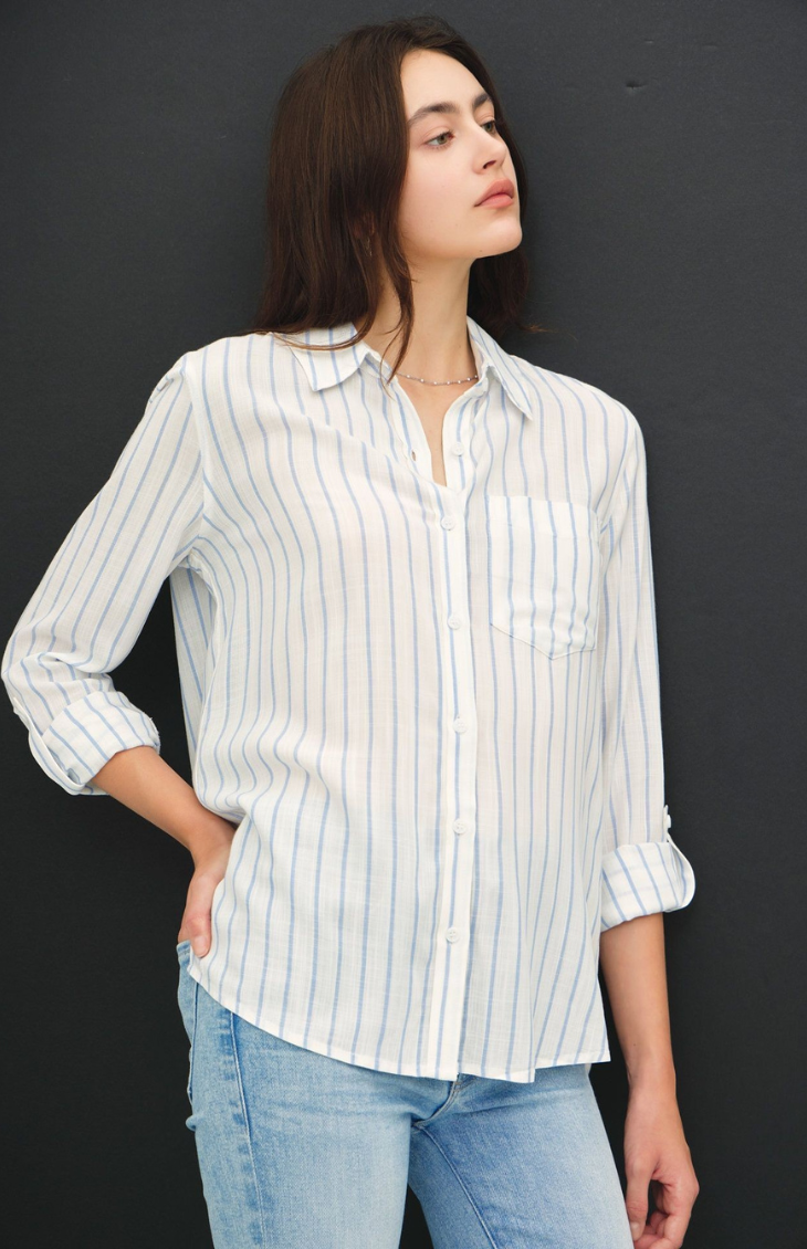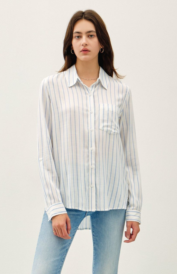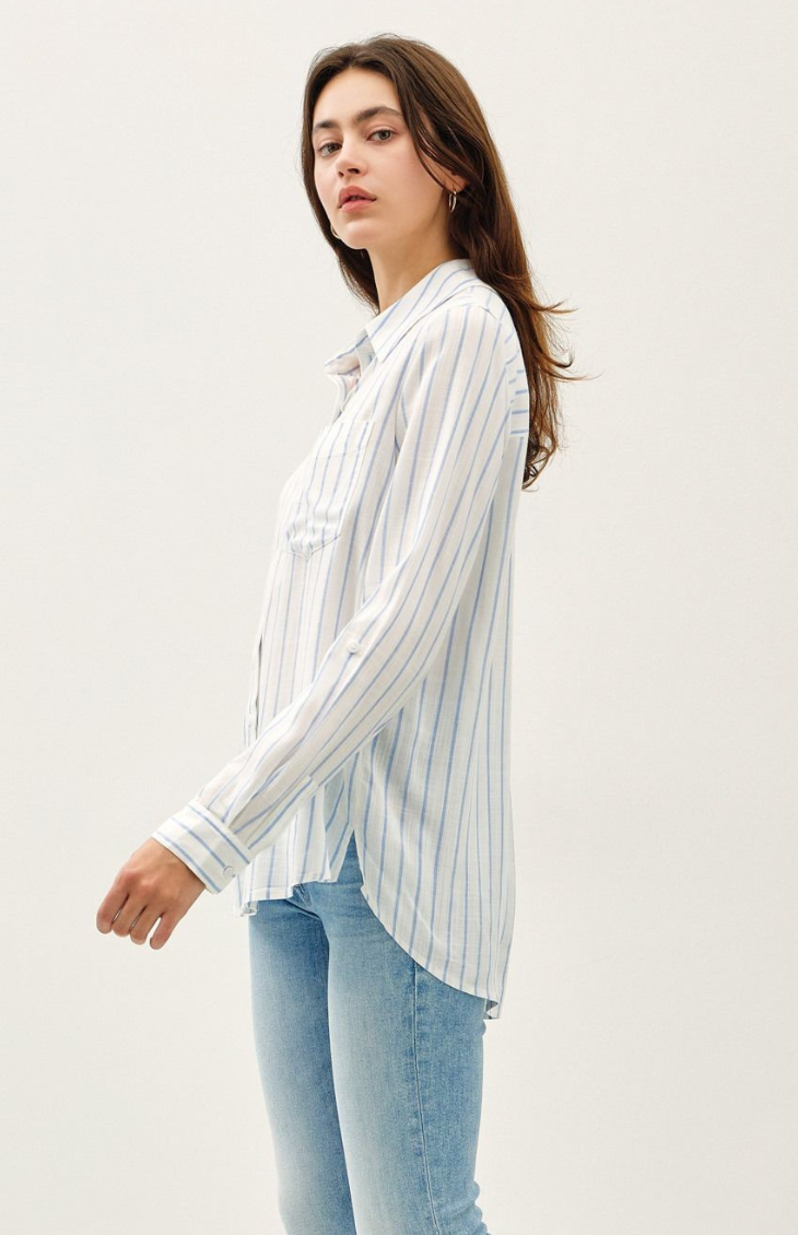 Light and airy, the Easy Layers Button Down Top is a versatile essential for any wardrobe. Designed with a relaxed silhouette, this top features a collared neckline, button-front closure, and a single chest pocket. The soft vertical stripes in cool tones make it an easy piece to layer or wear on its own for a fresh, effortless look.