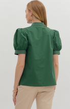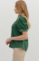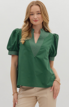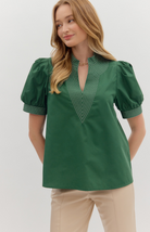The Everglades Top is a modern classic with bold charm. Designed with short puff sleeves and a structured V-neckline, this top stands out with its intricate contrast stitch detailing that adds depth and style. Crafted from lightweight woven fabric, it offers a polished yet comfortable fit perfect for workdays or evenings out.