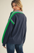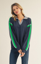 The Henry Sweater is a sporty knit addition to your fall wardrobe featuring a soft navy base with grey-blue and bright green accent stripes at the sleeves and polo collar. Pair with cozy jeans or throw on over your favorite workout set.