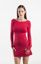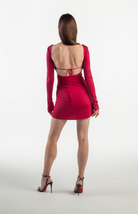 The Josie Mini Dress is a long-sleeve, body-hugging design in bold red. It features an open back with criss-cross tie detailing and a ruched effect along the sides and back. Made from stretchy, form-fitting material, it creates a sleek silhouette, making it perfect for evening events or a night out.