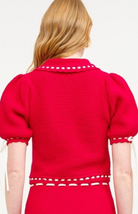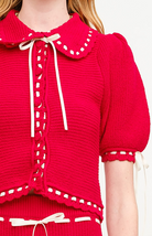 The Lily Red Blouse is a playful textured knit top with contrast white ribbon detailing throughout for a coquette-aesthetic look. It features puff sleeves, a rounded polo collar, button-down closure down the front, and scalloped trim. This blouse exudes charm and character. Pair with your favorite jeans or a white mini skirt.