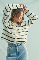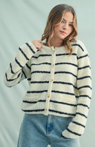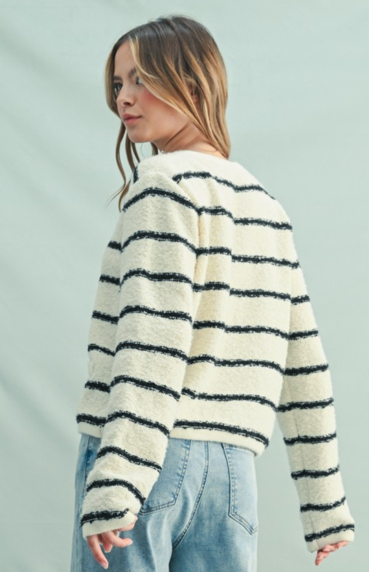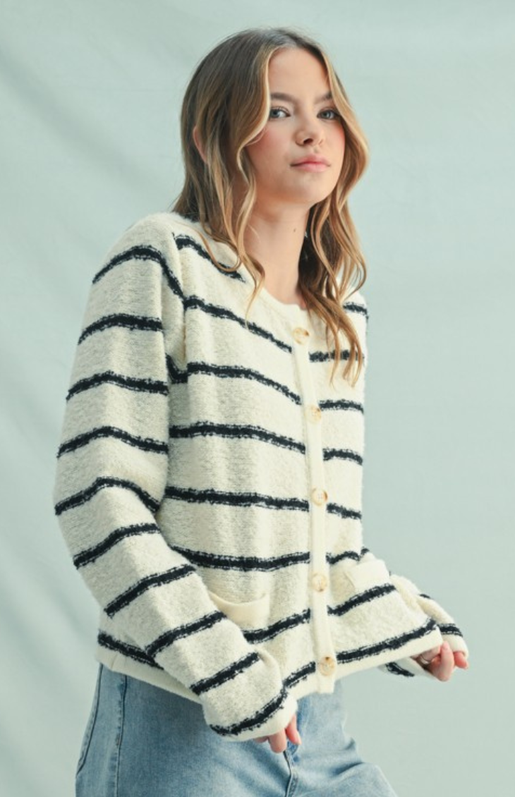 Soft and timeless, the Marnie Cardigan features a cozy layering piece in classic cream with bold black stripes. Detailed with a button-front closure and patch pockets, this relaxed, yet not oversized silhouette pairs perfectly with denim for an effortlessly chic, laid-back look.