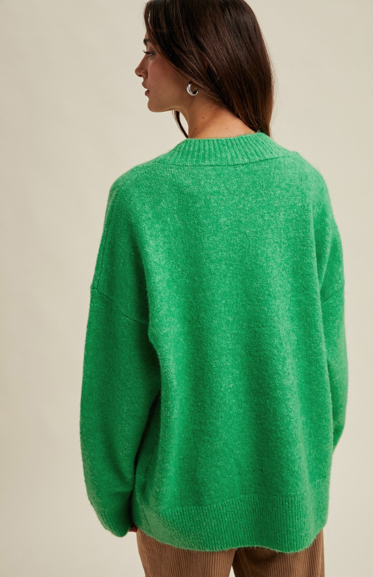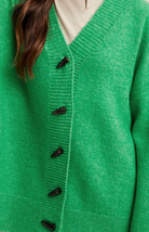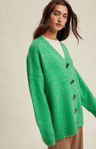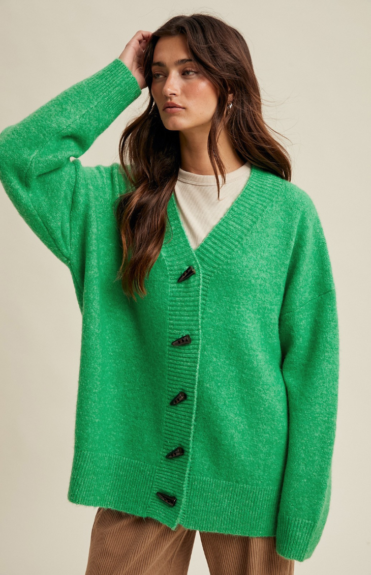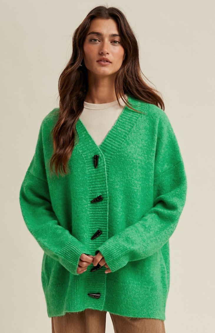 Cozy up in color with the Matcha Cardigan—a plush, oversized knit layering piece in a vibrant green hue. Featuring a deep V-neckline, chunky ribbed trim, and unique toggle-style buttons, this statement sweater is equal parts comfy and cool. Wear it layered over neutrals or as a bold contrast to your favorite prints.