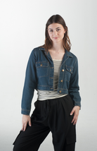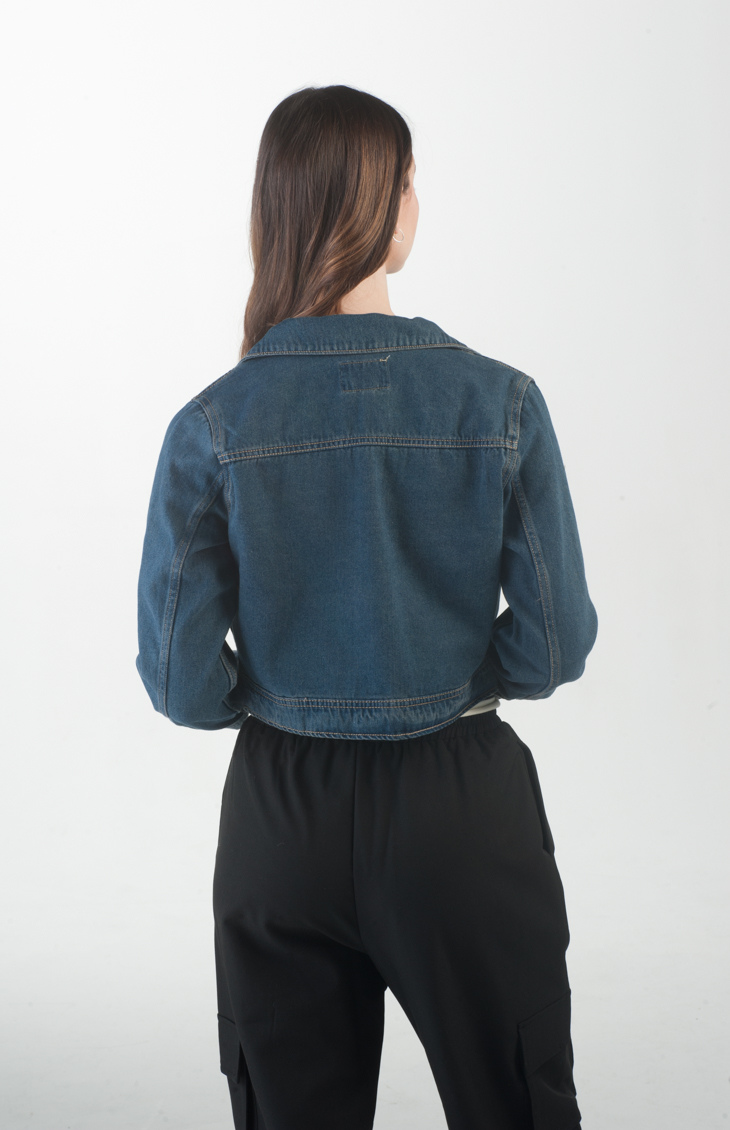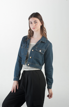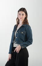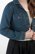 The Mateo Jacket offers a classic medium-wash denim look with a modern cropped length. Featuring gold-tone buttons, two front flap pockets, and long sleeves with buttoned cuffs, this versatile jacket is perfect for layering over casual or dressier outfits. Ideal for transitioning between seasons with style.