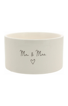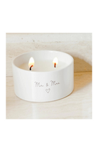 10 oz 100% soy wax floral jasmine tranquility-scented candle. The front of the candle has a simplistic "Mr & Mrs" matte bronze decal accompanied by a heart on a glossy white exterior smooth-edged vessel with glossy cream interior walls.