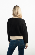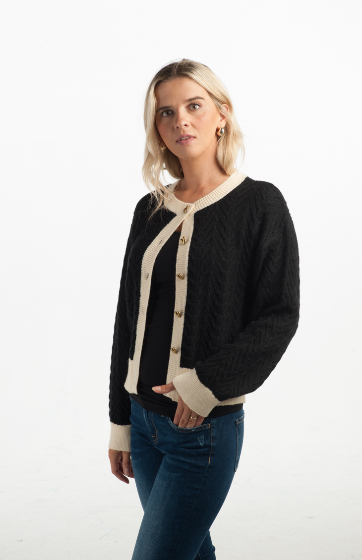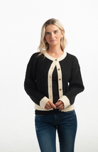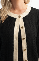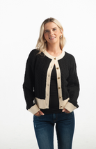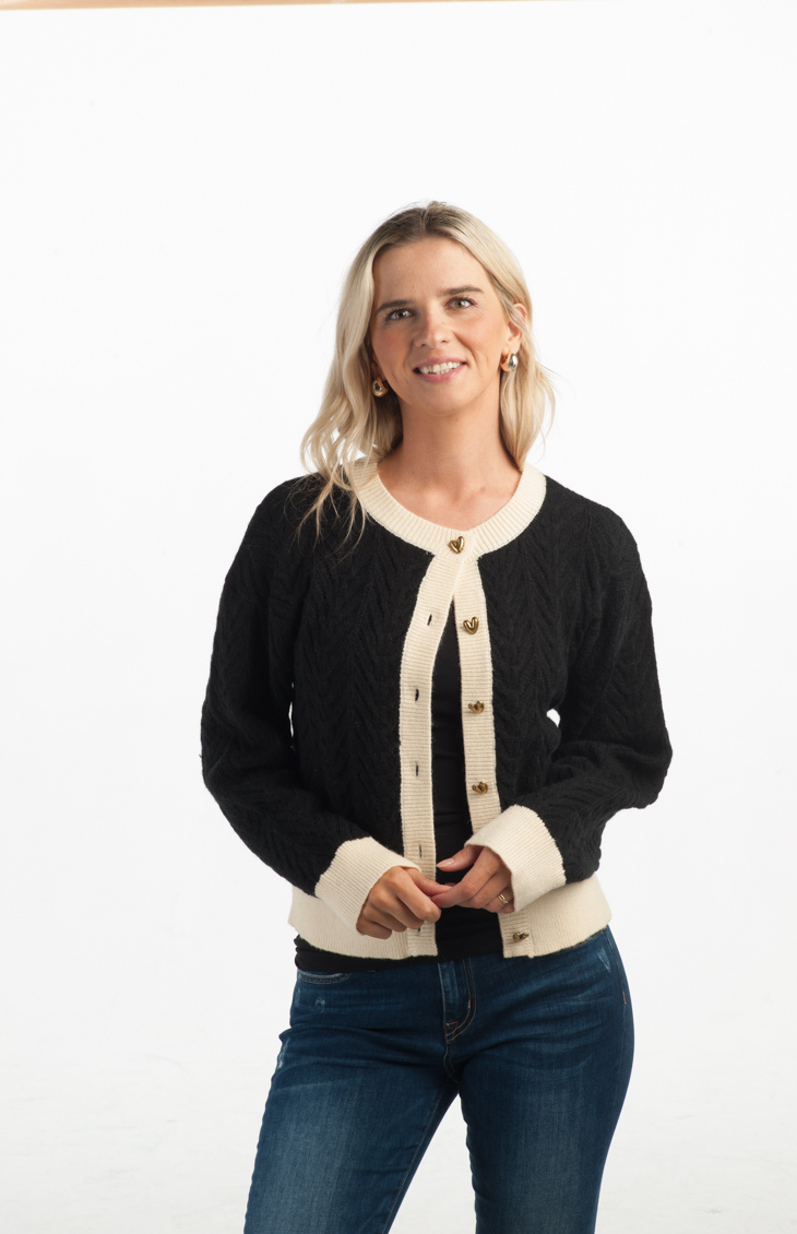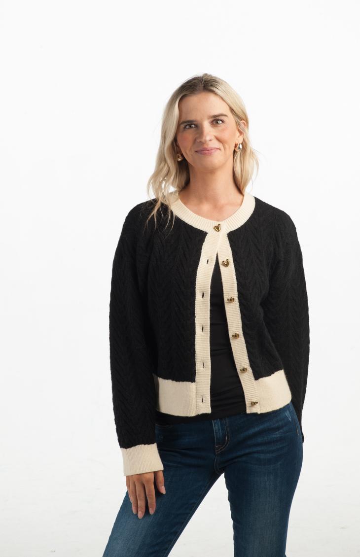 Introducing the On the Market Cardigan, a sophisticated black cardigan featuring cream accents on the hem and charming gold heart button detailing. Crafted from cozy sweater material, this cardigan combines elegance with comfort, making it perfect for layering or wearing on its own.