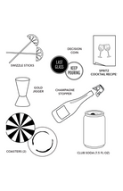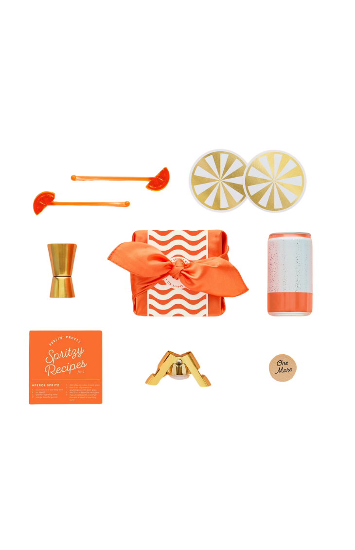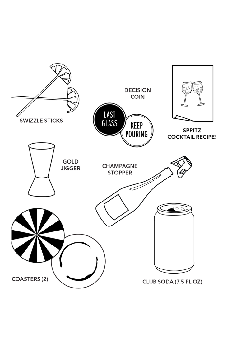 Nothing says summer like a spritz! The Spritz Kit includes effervescent accessories & essentials to make spritz season a bubbly one. This drink kit is all ready to-go -- just add the alcohol! Inside contains 9 must-haves: champagne bottle stopper, gold jigger, 2 orange themed swizzle sticks, 2 coasters, 7.5 fl.oz. club soda, a spritz recipe card and a decision coin.